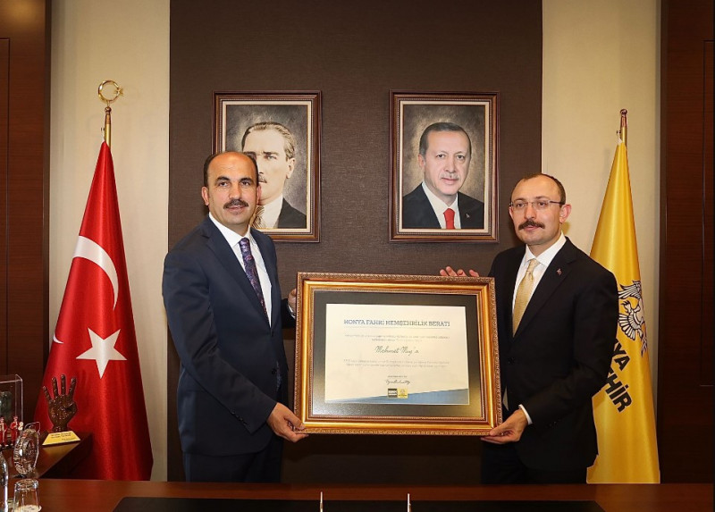 Başkan Altay ziyaretin sonunda Bakan Muş’a Konya Fahri Hemşehrilik Beratı takdim etti.